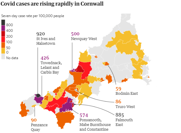 Rates are currently high in Ponsanooth, Mabe Burnthouse and Constantine, where the surge has been linked to an outbreak at the Penryn campus shared by Exeter and Falmouth universities.